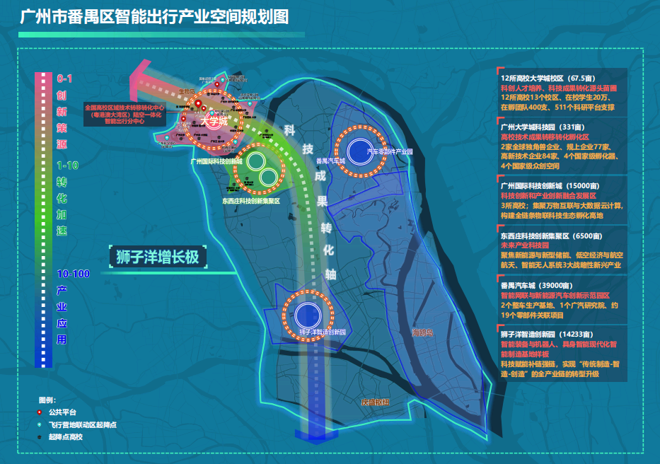 面向“十五五”,番禺区已明确将低空经济作为推动区域经济转型升级的关键引擎,将智能出行作为衔接汽车千亿产业集群与高校科创资源的核心赛道。未来,番禺将围绕成果转化全周期,构建众创、孵化、加速、转化全链条布局,全面打通高校创新成果 “0-1-10-100” 转化服务链条,举全区之力建设广州大学城产学研用创新策源岛。